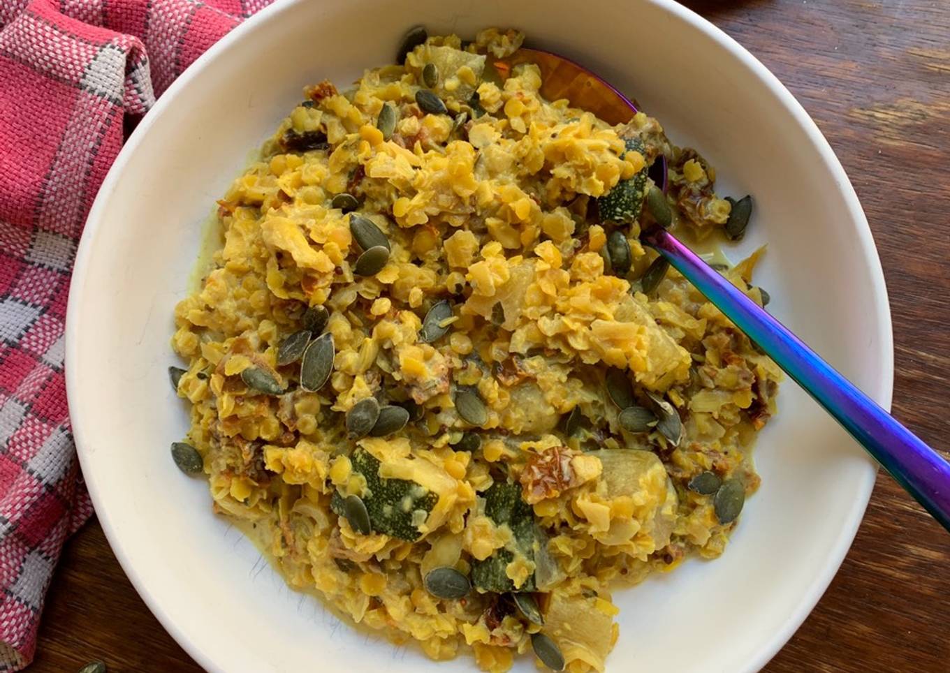 Façon One Pot Pasta ... On met tout dans une casserole et tout cuit en même temps !! #recettesimple #recettefacile #recetterapide Un plat à base de lentilles corail, coco, curry et courgettes, le tout relevé par quelques épices faciles à trouver ! En 15 minutes c’est prêt !
