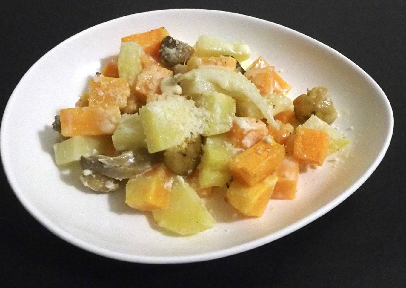 - Couper la courge en petits dés, l'oignon en lamelles, et les pommes de terre en rondelles. Couper les champignons et concasser les marrons. Déposer tous les légumes dans un plat à gratin.