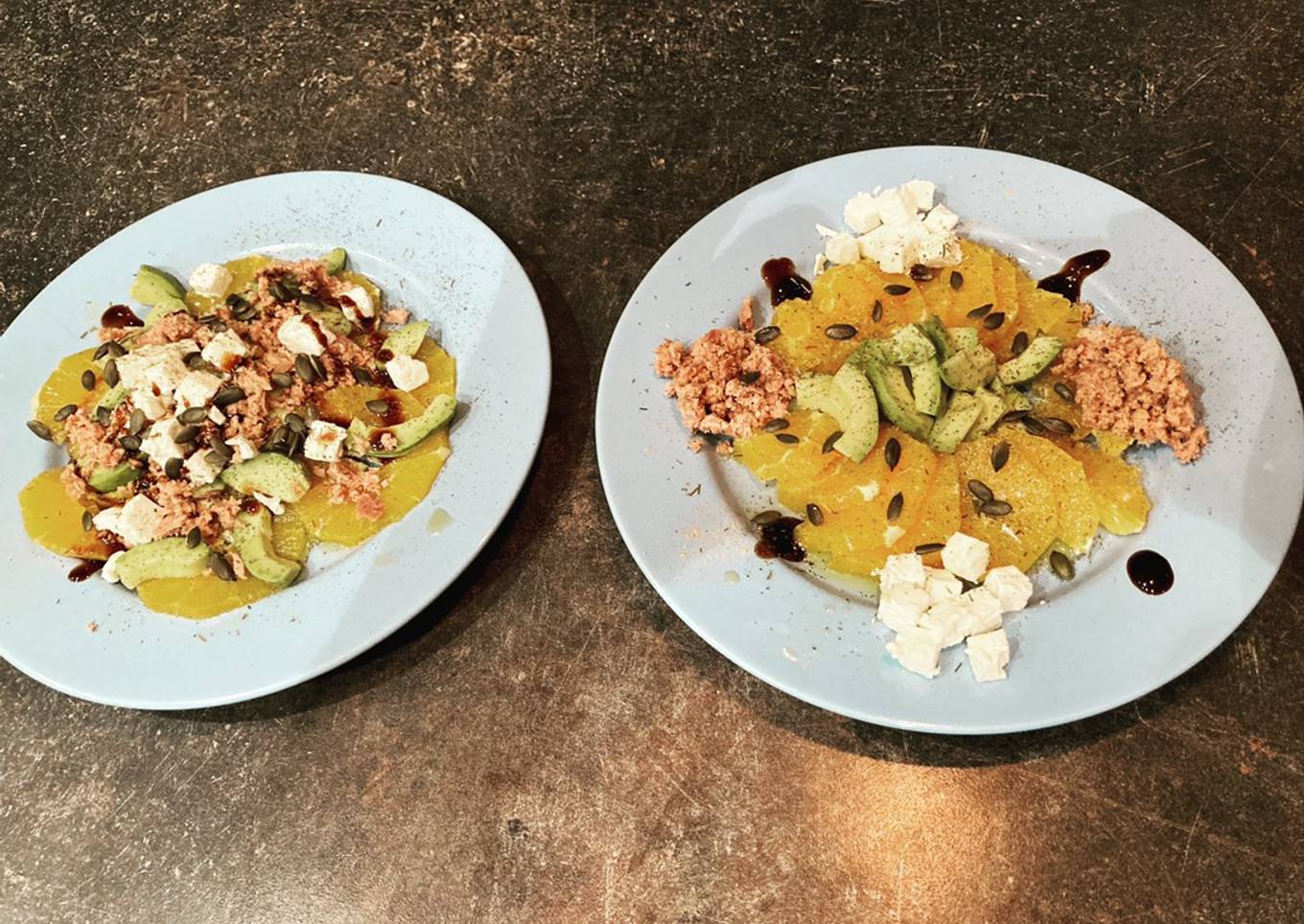 - Éplucher et couper en morceaux les oranges et l’avocat. Disposer dans l’assiette tous les ingrédients. Saler, poivrer et ajouter les herbes (pour ma part, marjolaine du jardin). Un filet d’huile d’olive et c’est prêt!